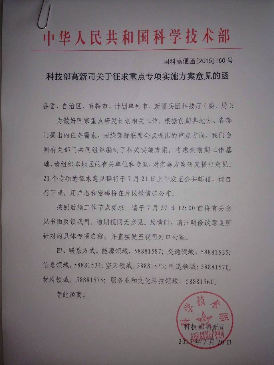 集团科技处收到天津市科委转发科技部高新司关于征求重点专项实施方案意见的函,从能源、交通、信息、空天、制造、材料等领域征集重点专项的意见。请相关教师提出建议和意见,根据公司放假安排,请尽量与本周五24日下班前将专项修改意见反馈至此邮箱brlulu@nankai.edu.cn。具体通知和2个相关专项实施方案请见附件。