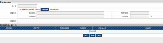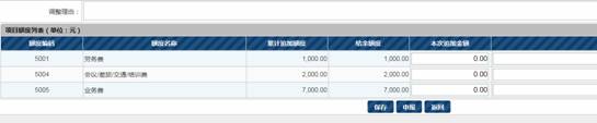 4.填写“调整理由”,在“本次追加金额”下,填写互相调整的金额,调增的为正数,调减的为负数,调增总额=调减总额,再点击“保存”按钮,核对无误后点击“申报”按钮。