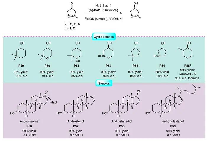鉴于手性环醇(如3-羟基哌啶)是许多药物的基元,也是天然产物的重要合成子,因此作者考察了各种脂肪族环酮(图4),均能以高收率和高对映选择性获得相应的环醇。如在0.1 mol% (R)-Cat1的存在下,以克级规模制备商用抗癌药物(R)-ibrutinib(2018年零售额为62.05亿美元)的活性成分——(S)-N-Boc-3-羟基哌啶(P52,1.4 g,收率:99%,e.e. 值:90%),而先前的报道则需要多步过程(Helv. Chim. Acta, 2014, 97, 1507–1515; Org. Process Res. Dev., 2014, 18, 827–830)。另外,通过动态动力学拆分对2-甲基环己酮进行不对称氢化,以98%的e.e. 值(trans/cis = 5:1)得到trans-2-甲基环己醇(P55)作为主要产物。当用于类固醇(S56-S59)的氢化反应时,也能以极好的收率(99%)和非对映选择性(> 99:1 d.r.)得到目标产物。