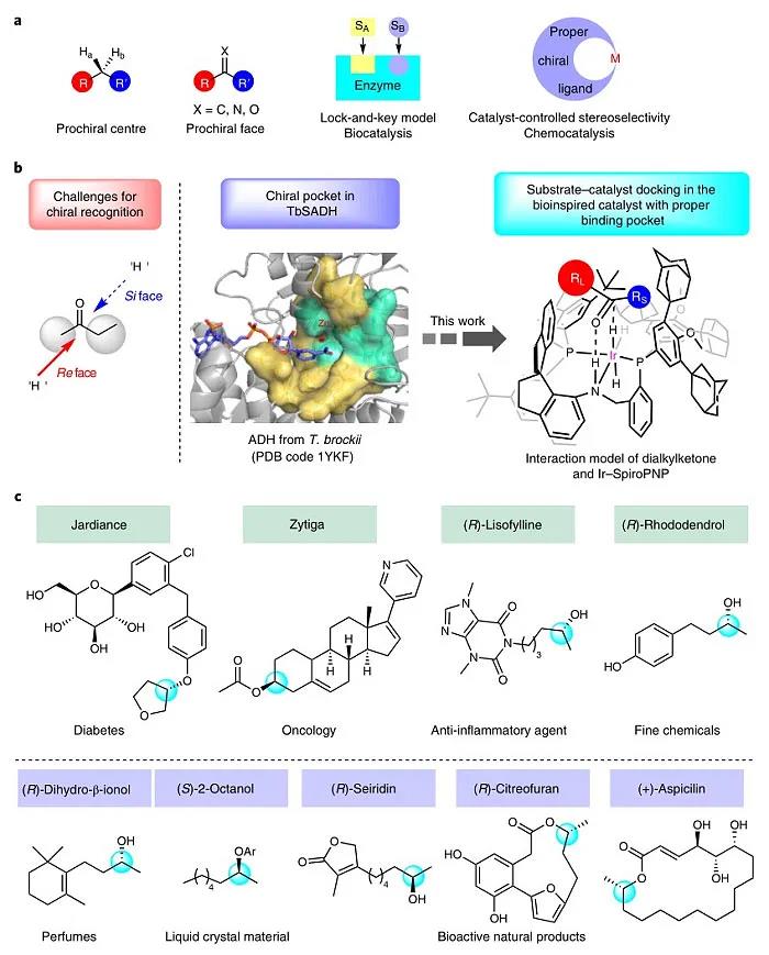 自19世纪Fischer开创不对称合成领域以来,不对称催化得到了迅速发展并广泛用于合成手性药物、农药以及精细化学品。具体而言,不对称催化是通过手性催化剂与底物的前手性中心或前手性面之间的精确识别来控制立体选择性。然而,当前手性中心或前手性面上两个基团的空间位阻和电性相似时(如二烷基酮类化合物),手性催化剂则难以区分。相比之下,生物催化中的次级相互作用(如氢键、静电/偶极相互作用、蛋白质芳香残基的π-π堆积)可确保酶和底物之间的准确识别,从而产生优异的立体选择性。受生物催化模型(特别是锁-钥模型)的启发,化学家开发出各种策略来控制立体选择性(Ber. Dtsch. Chem. Ges., 1894, 27, 2985–2993; J. Am. Chem. Soc., 2013, 135, 12480–12496),例如:为特定的不对称反应量身定制的手性催化剂(图1a)。