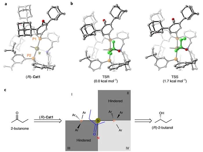 为了探究反应对映选择性的起源,作者对(R)-Cat1催化的2-丁酮氢化反应进行了密度泛函理论(DFT)计算。(R)-Cat1的球棍模型表明P2原子上的3,5-二叔丁基苯基、P1原子上的3,5-二金刚烷基以及配体的螺环骨架构成了一个深而狭窄的手性口袋(图6a)。由于该口袋具有拥挤的手性环境,当底物靠近催化剂的活性中心时,其方向会受到限制。计算表明R产物过渡态(TSR)的能量要比S产物过渡态(TSS)的能量低1.7 kcal mol -1 (图6b),这与该反应得到R产物的实验结果一致。此外,作者还利用象限模型来解释2-丁酮不对称氢化反应中(R)-Cat1的对映体控制(图6c)。象限II和III分别被具有金刚烷基和螺双茚满的芳基所占据。象限IV中的芳基与金刚烷基连接,使其比象限I中的芳基(与叔丁基相连)更拥挤,这允许底物以si-面接近催化剂,从而形成了R产物。