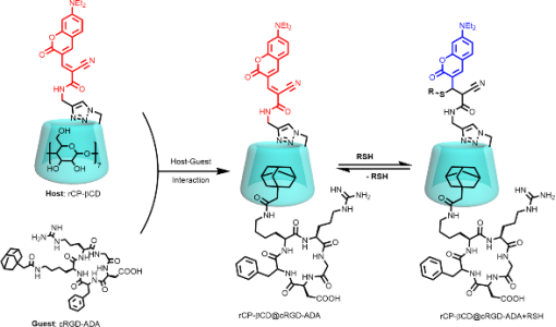 英国上市公司365刘育教授课题组在以环糊精构筑的智能组装体方面做了大量的工作,近期发表的论文(Science Advances, 2018, 4, eaat279; Angew. Chem. Int. Ed., 2018, 57, 8649; Angew. Chem. Int. Ed. 2020, 59, 7655; Advanced Science, 2020, 10.1002/advs.202000803; Adv. Therap. 2018, 180013; Chem. Sci., 2019, 10, 3346; Adv. Optical Mater., 2019, 1900589; Adv. Mater., 2019, 1806158; Chem, 2019, 5, 553; Adv. Opt. Mater., 2017, 5, 1700770)。作者在前期工作基础上,将具有Michael加成位点的香豆素衍生物以共价键的方式修饰到环糊精上,利用环糊精小口端的羟基与生物硫醇之间的氢键作用,不仅将生物硫醇固定在环糊精周围,而且提高了巯基的亲核性,实现了对生物硫醇的高灵敏检测。同时,通过主-客体作用包裹金刚烷修饰的c-RGD,赋予了荧光探针靶向癌细胞的能力(图1)。