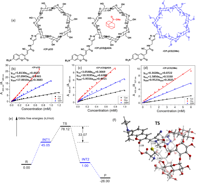 通过对比不同环糊精的衍生物rCP-βCD、rCP-βCD(OMe)以及rCP-βCD@ADA对生物硫醇的检测性能,可以得出羟基被甲基化以后,Kd值明显增加;然而,环糊精空腔的占据并为对检测性能造成影响,表明环糊精周围的羟基是影响反应效率的关键因素。此外,DFT计算证实了生物硫醇可以与环糊精通过氢键的作用结合在一起。