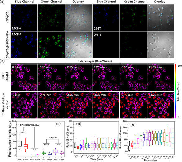 在活细胞成像过程中,相对于rCP-βCD,rCP-βCD@cRGD-ADA超分子组装体具有优异的癌细胞靶向性。当癌细胞收到外界刺激以后,利用rCP-βCD@cRGD-ADA可以对活细胞内的生物硫醇进行实时动态监测。