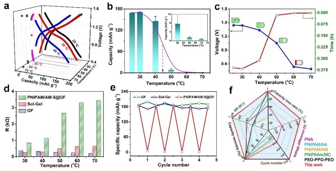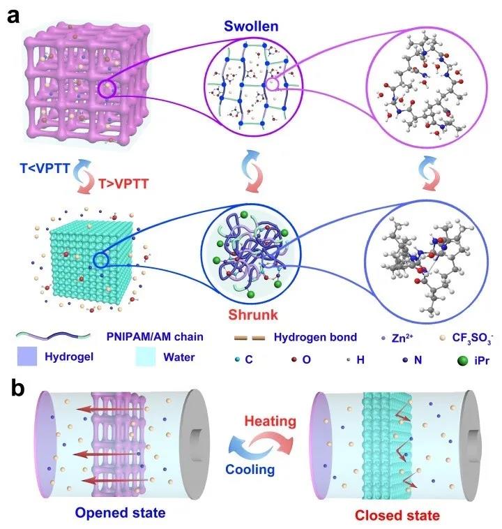 水系锌离子电池由于其低成本、高理论比容量等优势引起了人们的广泛关注。然而,在快速充放电过程中,锌离子电池内部通常会产生大量热量,引发热失控现象,造成其电化学性能不可逆衰减。因此,需要开发智能自保护的锌离子电池。一般情况下,可利用溶胶-凝胶转化型热敏电解质来实现储能器件的自保护,然而不稳定的自恢复能力限制了其应用。聚(N-异丙基丙烯酰胺)(PNIPAM)基水凝胶是一类具有多孔网络结构的热响应聚合物。当温度超过其体积相变温度(VPTT)时,由于PNIPAM链的分子内氢键的形成,PNIPAM基水凝胶的多孔结构会发生收缩,因此能够控制电解质离子在电极间的迁移,并能够实现电化学储能器件的自保护。而且,当冷却至室温后,由于PNIPAM链的分子构型得以重筑,PNIPAM基水凝胶的多孔网络结构重现,展现了高度可逆性以及热开关性。