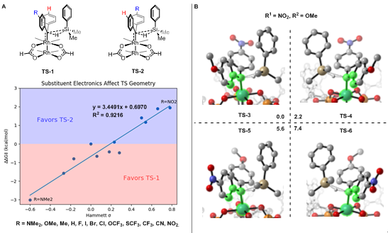 为了解释电性对反应对映选择性的影响机制,作者进行了计算化学研究。为了简化计算,避免催化剂空间位阻造成的影响,他们首先选择四甲酸双铑催化剂(Rh2(O2CH)4)作为模型催化剂,计算了二芳基卡宾对硅氢键插入反应的过渡态。结果显示反应经历了协同三元环过渡态,过渡态中一个芳环与卡宾平面几乎共平面,另一个芳环则与卡宾平面几乎正交。当其中一个芳环上有取代基时,则会出现两种过渡态结构(TS-1和TS-2)。这两种过渡态的能量不同,富电子芳环与卡宾共平面时过渡态能量更低,两个过渡态的能量差与相应取代基的Hammett常数(σp)呈线性相关(图4A)。