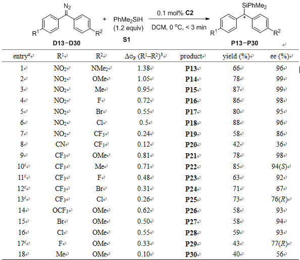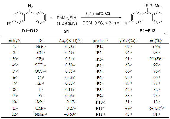 图2. 单取代双芳基卡宾对硅氢键的不对称插入反应