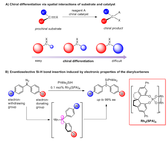 图1. 潜手性面的识别及双芳基卡宾对硅氢键的不对称插入反应