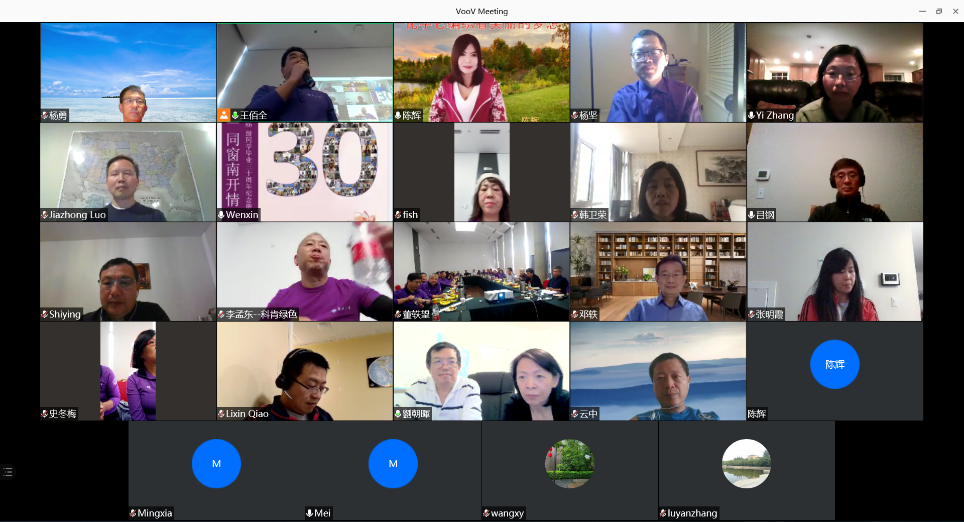 虽然有约十小时的时差,大洋彼岸的同学们坚持隔屏互动。摩根大学终身讲习教授杨坚员工表示:“聚会使我更关心南开了,咱们化学很有活力!”任职于澳大利亚昆士兰大学分子生物所的刘立功员工说:“选择南开,是人生最重要的一次选择。厚实的专业知识,扎实的实验技术,独立思考的能力,是南开留给化学人永远值得骄傲的素质。”他表示非常希望能用自己的成果能为祖国做点事。来自武汉的付前发同学在活动现场表达了对同学们的感谢。疫情中世界各地的同学,给予了他各方面的关心和鼓励,暖暖的同窗情谊帮助他建立信心,走出难关。员工们纷纷发言,追忆当年、展望未来,云端上下气氛热烈,几度唏嘘。