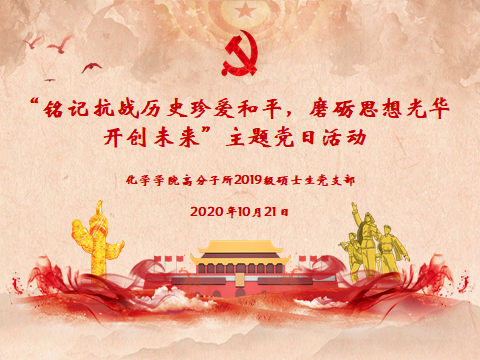 2020年是中国人民抗日战争暨世界反法西斯战争胜利75周年,也是《新时代爱国主义教育实施纲要》的学习贯彻落实重点时期。10月21日,高分子所2020级硕士党支部在化学楼六楼多功能厅开展“铭记抗战历史珍爱和平,磨砺思想光华开创未来”为主题的党日活动,以重温革命抗战历史,弘扬爱国主义情怀,坚定理想信念。