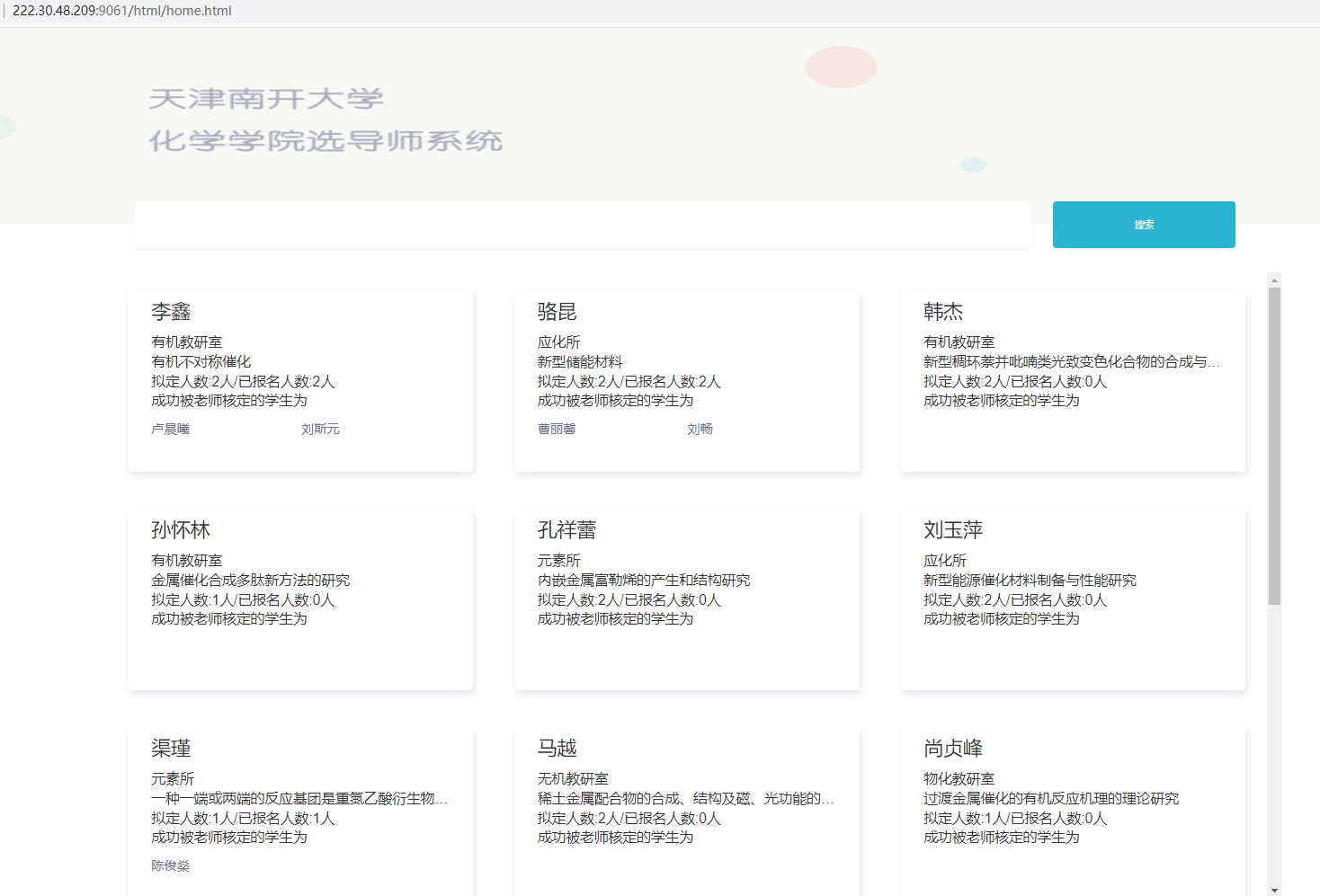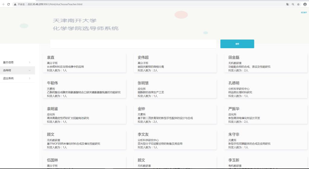 点击左侧菜单栏的“选导师”,可看到不同导师及其相应的课题(如下图);单击想要选择的课题,点确定,课题框变蓝代表预约成功。