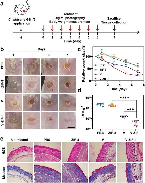 在这项研究中,作者通过Zn2+与伏立康唑的配位结合,成功地制备了内置伏立康唑(抗真菌药物)的金属有机骨架(V-ZIF)。配位结合使V-ZIF具有良好的稳定性,并实现了抗真菌药物的零级释放动力学。白色念珠菌生物膜内的酸性环境能触发伏立康唑与金属有机骨架分离进而实现其释放。V-ZIF能穿透白色念珠菌生物膜和阻止白色念珠菌聚集而产生更好的扩散进而导致真菌细胞膜损伤和白念珠菌死亡。在白色念珠菌感染的开放性伤口中,V-ZIF表现出良好的抗真菌性能和促进伤口愈合的能力且无明显副作用。此外,将抗真菌药物内置于金属-有机框架中的策略也适用于其他含给电子结构域的药物,如唑类、二嗪类和吡啶类,以改善其药代动力学性能并减少其副作用。