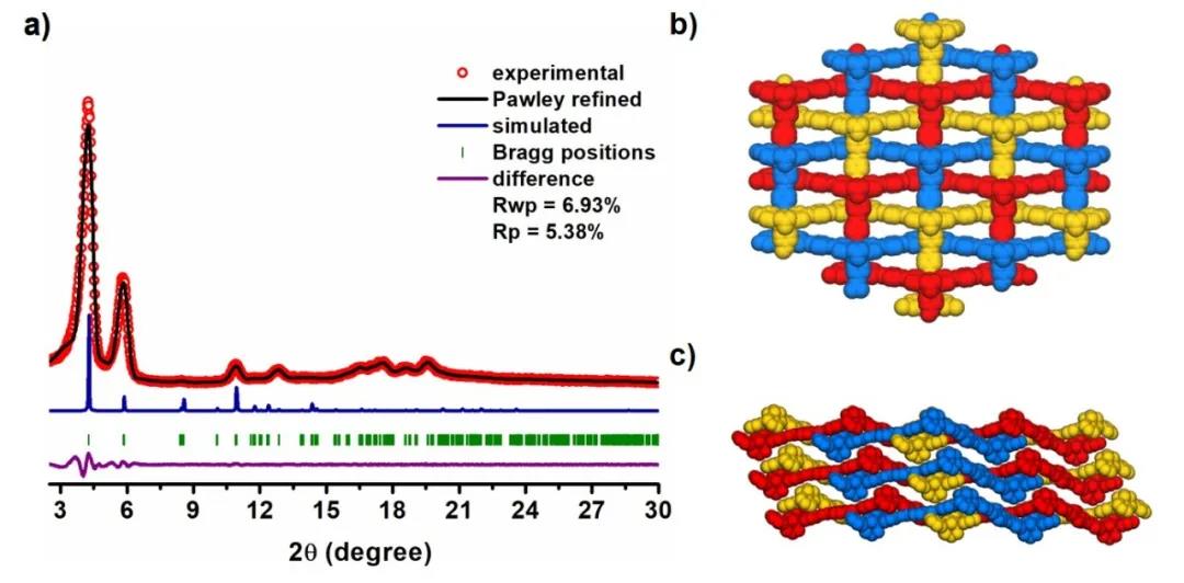 图5. a) NKCOF-6的粉末衍射谱图,b) NKCOF-6的模拟结构,c) NKCOF-6的侧视图