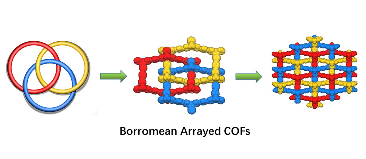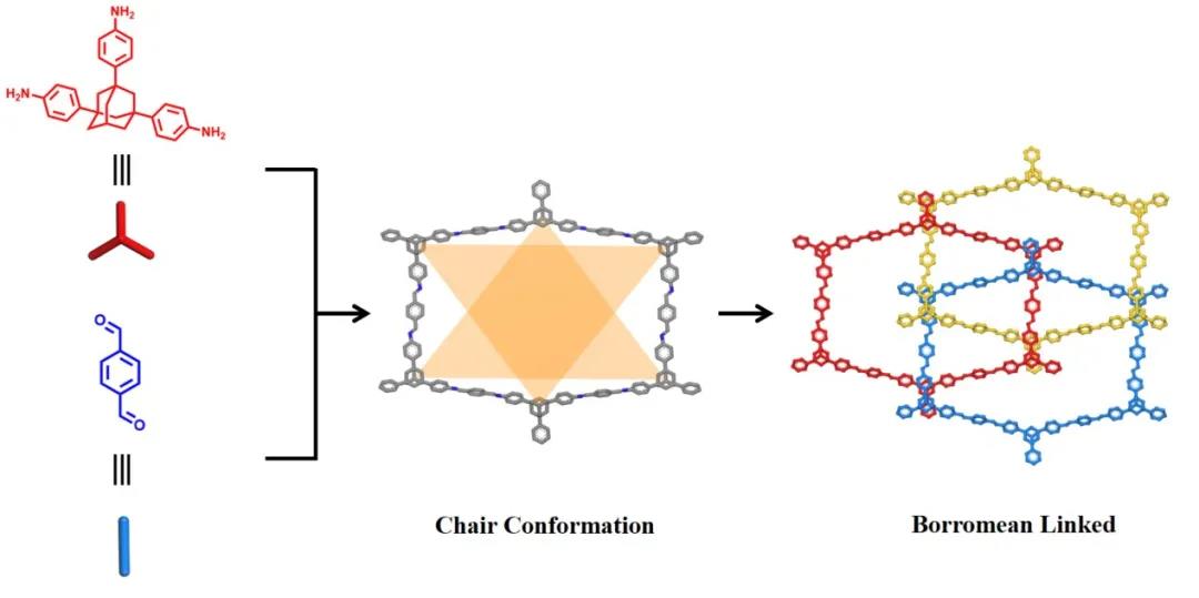 Borromean环结构,是指三个环相互穿插在一起,但是任意两个环之间都没有任何扣锁现象[9]。由于其独特的拓扑复杂性、结构完整性和优雅的美感,Borromean环结构吸引了来自各种背景的科学家的关注。第一例自组装形成的Borromean分子环是由诺贝尔化学奖得主Stoddart爵士于2004年发表的;随后科学家利用配位或氢键自组装构建了Borromean环结构的MOFs和HOFs等。然而,合成具有Borromean环结构的有机高分子材料从未被报道过。