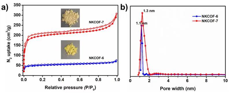 图6. a) NKCOF-6和NKCOF-7的N2吸脱附等温线。b) NKCOF-6和NKCOF-7的孔径分布