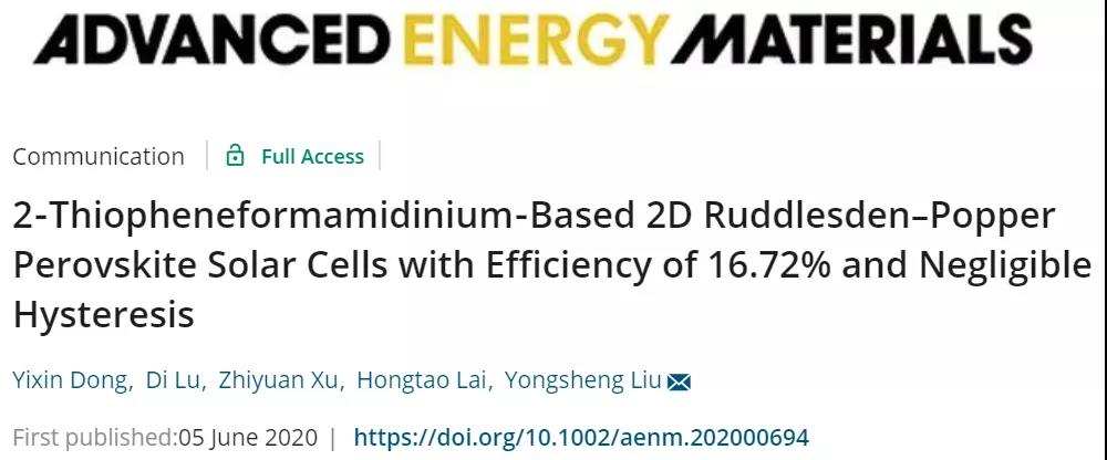 Yixin Dong, et al. 2‐Thiopheneformamidinium‐Based 2D Ruddlesden–Popper Perovskite Solar Cells with Efficiency of 16.72% and Negligible Hysteresis. AEM 2020.