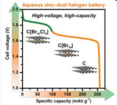 2)实验结果显示,双卤素氧化还原电偶(Br0/Br−和Cl0/Cl−)的使用有效地将平均放电电压从1.60 V(单独使用Br0/Br−)提高到1.71 V,并将容量从78 mAh g−1提高到257 mAh g-1。