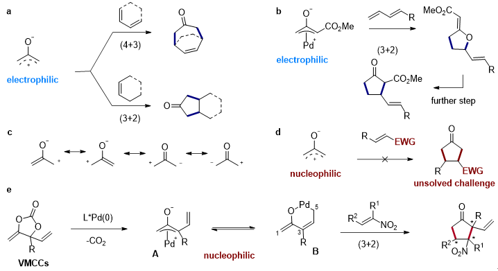 氧烯丙基正离子(Oxyallyl cations)是一类同时含有带正电荷的烯丙基部分和带负电荷的氧原子活性中间体,文献报道其具有很强的亲电性。在已报道研究工作中,相关环化反应局限于富电子烯烃参与的(4+3)或(3+2)反应,同时也仅实现了呋喃化合物参与的不对称环加成反应,而在改变氧烯丙基正离子的反应性,使其具有亲核性,实现缺电子烯烃参与的不对称环加成反应仍没有得到解决(图1)。