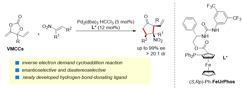 在计算结果的支撑下,作者首先尝试了VMCCs 1a与硝基乙烯2a的反电子需求(3+2)环加成反应。虽然反应能够顺利的进行,然而尝试了许多常规手性配体均不能得到较满意的对映选择性。考虑到体系中包含氧负离子有可能可以通过氢键的形式引入手性诱导因素,作者因此设计了一类新型的双功能氢键膦配体(FeUrPhos),利用氢键弱相互作用,来提高反应活性和控制立体选择性(图3)。