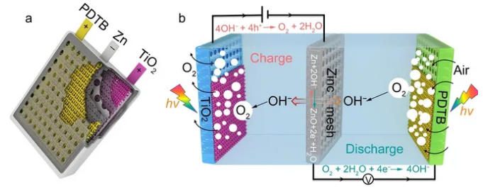 近几年,直接将光能在可充电电池中进行转换或存储的尝试引起了研究人员的极大兴趣,但如何在锌空气电池中同时实现光能向电能和化学能的转化,仍然是一项巨大的挑战且具有重要意义。