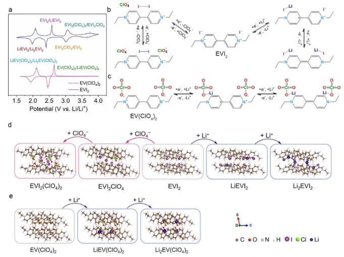 鉴于此,英国上市公司365陈军院士团队首次对具有代表性的两类紫精晶体(EVI2和EV(ClO4)2)正极材料的锂电池性能、储能机制以及结构演变进行了研究。单晶衍射结果表明,EVI2和EV(ClO4)2具有均一单斜晶体的形式,其中有机层EV2+和无机层I-/ClO4-交替排布。电池性能测试结果表明,由于具有阴离子储存能力,EVI2正极表现出高达3.7V的放电平台;而EV(ClO4)2正极由于晶格中存在着导电性良好的ClO4-层而表现出优异的倍率性能,即使在5C的超高倍率下也能够实现其理论比容量的78%。原位结构表征和理论计算发现,这两种正极材料在氧化过程中都能保持高度可逆的晶体结构和分子结构的稳定性,使其在循环200圈后的容量保持率仍然高达96%。