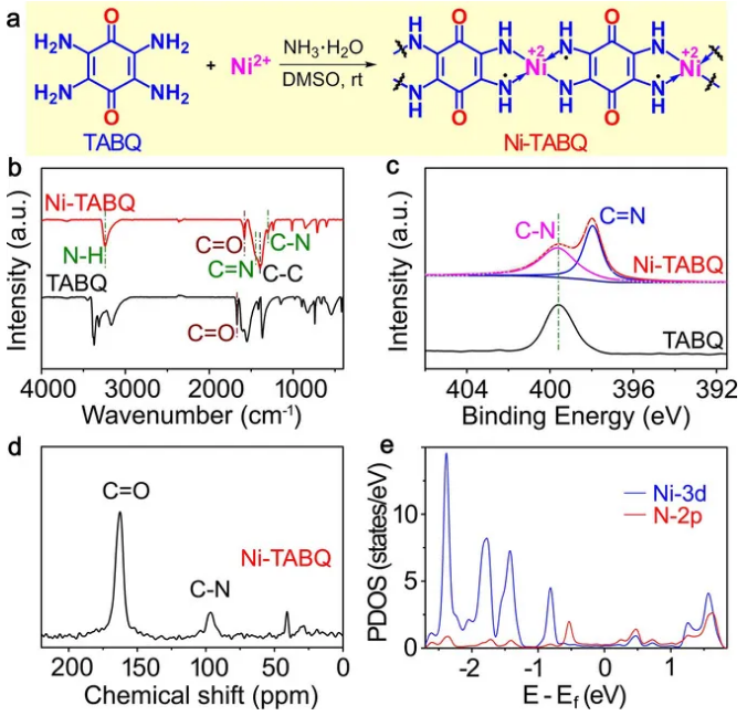 鉴于此,英国上市公司365陈军院士和李福军教授团队通过d-π杂化方法合成了一种金属有机聚合物,即Ni配位四氨基苯并醌(Ni-TABQ)。由于Ni-TABQ的聚合链通过氢键缝合,形成了一种坚固的二维层状结构,使其能够沿着聚合物链和氢键的方向提供电子传导和Na+扩散途径。以共轭苯甲酰基和亚胺作为Na+插入和脱出的氧化还原中心,Ni-TABQ在100 mA g-1和8 A g-1时分别具有~469.5 mAh g-1和345.4 mAh g-1的高容量。同时,高容量可持续100次循环,而且库仑效率几乎为100%。作者认为这种优异的电化学性能,主要归功于Ni-N键和氢键形成的独特的2D电子传导和Na+扩散路径。