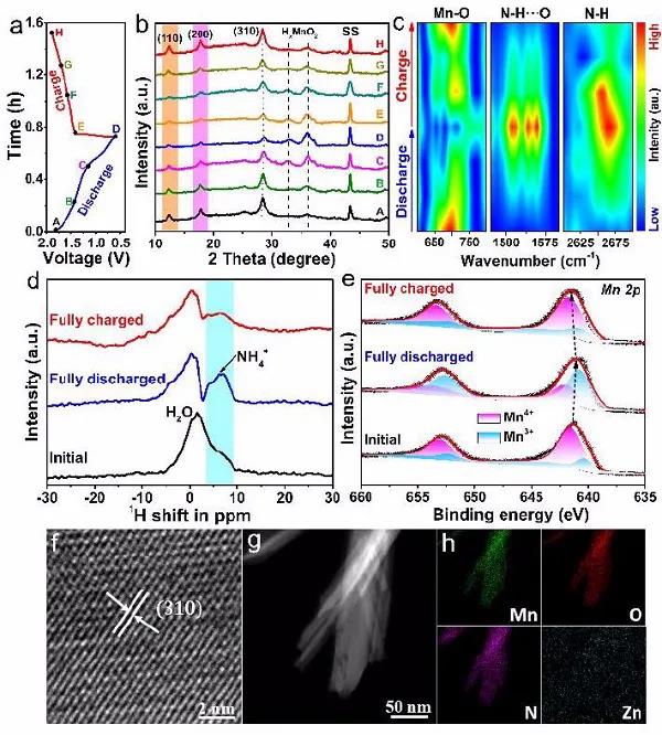 图2. Zn/MnO2电池的储能机理。a)电流密度为0.5 A g-1的第三圈充放电曲线。b)XRD。c)FTIR谱。d)固态1H NMR光谱。e)不同荷电状态下的Mn 2p XPS。f-h)完全放电的MnO2正极的HRTEM和TEM元素分布图。