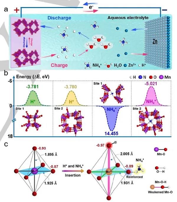 图1. a)水系Zn/MnO2电池中H+/NH4+离子的共嵌入机理。b)根据第一性原理计算得出H+或NH4+离子在MnO2中的嵌入能。c)H+和NH4+离子嵌入MnO2后,MnO2的局部几何形状和电荷分布。