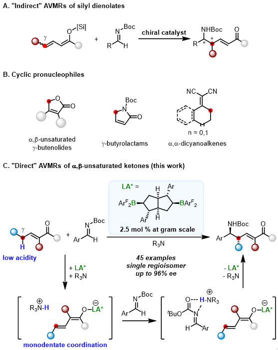 α,β-不饱和羰基化合物的不对称Vinylogous Mannich反应(简称“AVMRs”)可以高效地合成光学纯的氨基化衍生物。然而,由于该类底物的γ位酸性较弱,去质子化较为困难,导致AVMRs研究主要使用“间接法”(图A),即不饱和羰基化合物在强碱性条件下与硅试剂反应(如TMSCl或TMSOTf),先生成共轭烯醇硅醚,再与亚胺反应。然而,该方法需要制备和分离共轭烯醇硅醚,原子利用率较低,而且制备共轭烯醇硅醚的反应通常会生成不可分离的E、Z混合物,为Mannich反应选择性带来挑战。与之相比,不饱和羰基化合物在碱作用下去质子化,原位生成共轭烯醇,并直接与亚胺反应,即“直接法”AVMRs,具有原子经济高、操作简便等优点。然而,迄今为止,“直接法”AVMRs研究的底物大多局限在环状化合物(图B),如α,β-不饱和γ-丁烯内酯、γ-丁内酰胺和环状的α,α-二氰基烯烃等。因为这类环状底物的γ位质子酸性较强,而且其刚性环状骨架对于控制区域(在α或γ碳上反应)和立体选择性至关重要。相较之下,发展非环状α,β-不饱和羰基化合物的“直接法”AVMRs极具挑战。中科院上海有机化学研究所的殷亮教授使用含辅助基团的非环状不饱和酰胺底物和金属路易斯酸催化剂,实现了高选择性“直接法”AVMRs(JACS 2017, 139, 2196; JACS 2018, 140, 15170),是该研究方向的重要进展。