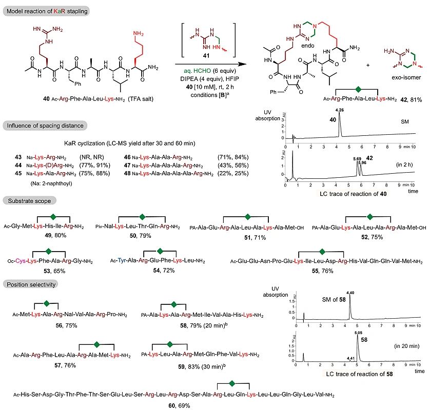 在研究不同残基对“KaY”成环带来的干扰时,作者意外发现在相同的反应条件下,精氨酸也能和赖氨酸在甲醛的参与下实现高效成环反应,而目前在温和条件下选择性修饰精氨酸的方法鲜有报道。如图4所示,向HFIP为溶剂的体系中加入6个当量的甲醛,反应2小时后能够以极高产率且选择性地得到以环状四氢-1,3,5-三嗪为特征结构的内外异构体混合物(在LC中的保留时间很近),作者称之为“KaR”产物,相应的反应称之为“KaR”反应。这种三嗪结构产物具有很强的亲水性,这在订书肽策略中也非常少见。