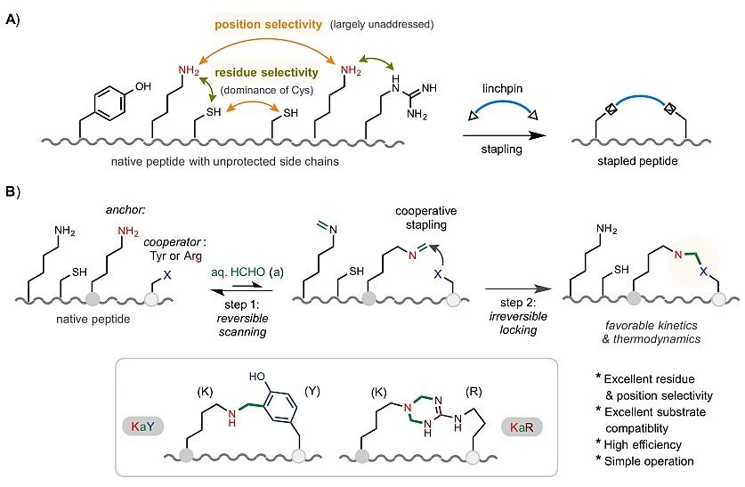 多肽分子的体积介于小分子药物与大分子之间,占据着重要的“中分子”(middle molecules)化员工物空间。天然多肽往往需要经过结构修饰才能成为更好的药物分子。在化学修饰技术中,订书肽(peptide stapling)策略在多肽结构和性质的调控以及多肽药物开发上已展示出其独特的功效。然而目前的装订策略往往需要在“处理过”的多肽底物上进行,如引入非天然氨基酸作为特定反应位点或需对侧链高活性基团进行保护。如果能避开底物的预处理,直接对天然多肽进行选择性装订,将会大大拓宽订书肽的适用性,为药物研发提供有力的改造工具。