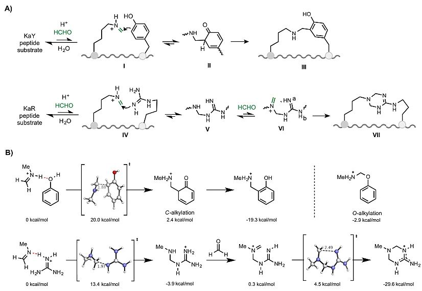 随后,通过与UCLA的Ken Houk 教授课题组合作,作者就反应进程通过密度泛函理论(DFT)进行了计算研究(图5B)。由甲醛和甲胺形成的N-甲基亚胺和苯酚来模拟赖氨酸、酪氨酸和甲醛的反应。计算结果表明,苯酚对亚胺离子的亲核进攻是整个过程的限速步骤,能量垒为20.0 kcal / mol。C-烷基化后,接着芳构化释放大量能量,酚类产物形成(∆G = -19.3 kcal / mol)。O-烷基化在热力学上远不令人满意(∆G = -2.9 kcal / mol)。赖氨酸与精氨酸的反应通过胍鎓与N-甲基亚胺的反应进行建模(阳离子亚胺鎓不会直接与胍鎓反应)。该反应过渡态类似于亲核胍进攻N-甲基亚胺基,是模型反应的限速步骤,能垒为13.4 kcal / mol。与甲醛反应并随后环化形成四氢三嗪环非常容易(∆G = 4.5 kcal / mol)。该反应能够释放足够的能量(ΔG= -29.6 kcal / mol),为完成整个反应提供了强大的驱动力。