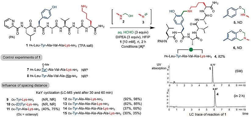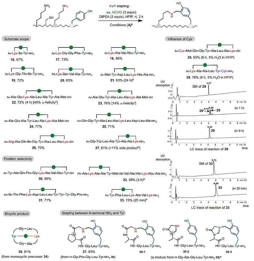 考虑到天然多肽具有丰富的亲核性残基,作者设想利用赖氨酸与醛基试剂形成亚胺后再被邻近的亲核基团进攻形成环肽从而实现“订书肽”的构建。作者首先尝试在赖氨酸和酪氨酸之间通过分子内的曼尼希型反应进行成环反应。实验如图2所示,作者发现在室温下以六氟异丙醇(HFIP)为溶剂,模型底物1与极少量的甲醛(3个当量)和碱(DIPEA)在2小时内便可以实现反应的定量转化得到成环产物4,且反应体系非常干净,半缩醛中间体2和3几乎没有产生。HFIP对于该反应的高效转化至关重要,而使用甲醇、乙腈或丙酮之类的溶剂则会明显抑制反应,少量水(<10%)的参与不会对反应影响很大。碱的添加也很重要,通过筛选发现使用有机碱(如DIPEA)收率要高于无机碱(如碳酸钾等)。最终得到的苄胺产物在生理以及酸性和碱性条件下都是可以稳定存在的,作者将这种赖氨酸、酪氨酸以及甲醛的三组分装订反应称为“KaY”反应。随后作者细致考察了赖氨酸和酪氨酸之间的间隔距离对成环反应的影响:通过在两个氨基酸之间增加丙氨酸(Ala)的个数,并在相同时间下来定量分析成环反应的速率。通过1个小时的监测发现,中间没有Ala间隔的底物9未得到任何环化产物,间隔2个或3个Ala的底物显示出较高的反应性(12、13),间隔1个、4个或5 个Ala的底物的反应速度中等。