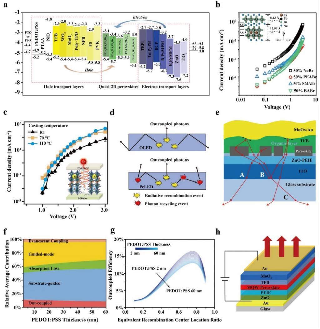 准二维钙钛矿发光二极管中ηoc 普遍低于30%,表明大部分光子会被困在里面,并因产生多余的热能而丢失。一般来说,产生的光在等离子体中会产生一系列的光模式,包括波导模式、表面等离子体激元(SPP)模式、衬底模式和外耦合模式。然而,只有外耦合模式(<20%)有利于光提取效率(LEE),而SPP模式(20%-30%)、波导模式(20%-30%)、衬底模式(10%-30%)和寄生吸收(<10%)在器件内消耗。因此,开发能够同时或分别提取波导模式、SPP模式和衬底模式的方法来进一步提高发光二极管的光提取效率和EQE是关键 (图4d-h)。