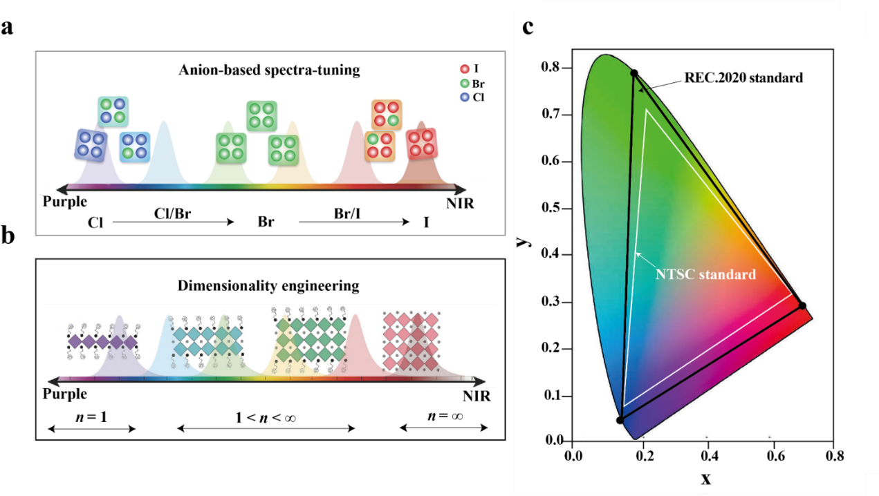 准二维钙钛矿可以通过化学组分和维度工程进行光谱调制,实现发射波长从紫外到近红外光谱区域的连续调谐。到目前为止,近红外和绿色准二维钙钛矿发光二极管已成功实现了超过20%的外量子效率,而实现高性能红光和蓝光准二维钙钛矿发光二极管还面临着诸多障碍,特别是满足显示用Rec.2020标准的纯红和纯蓝发射。