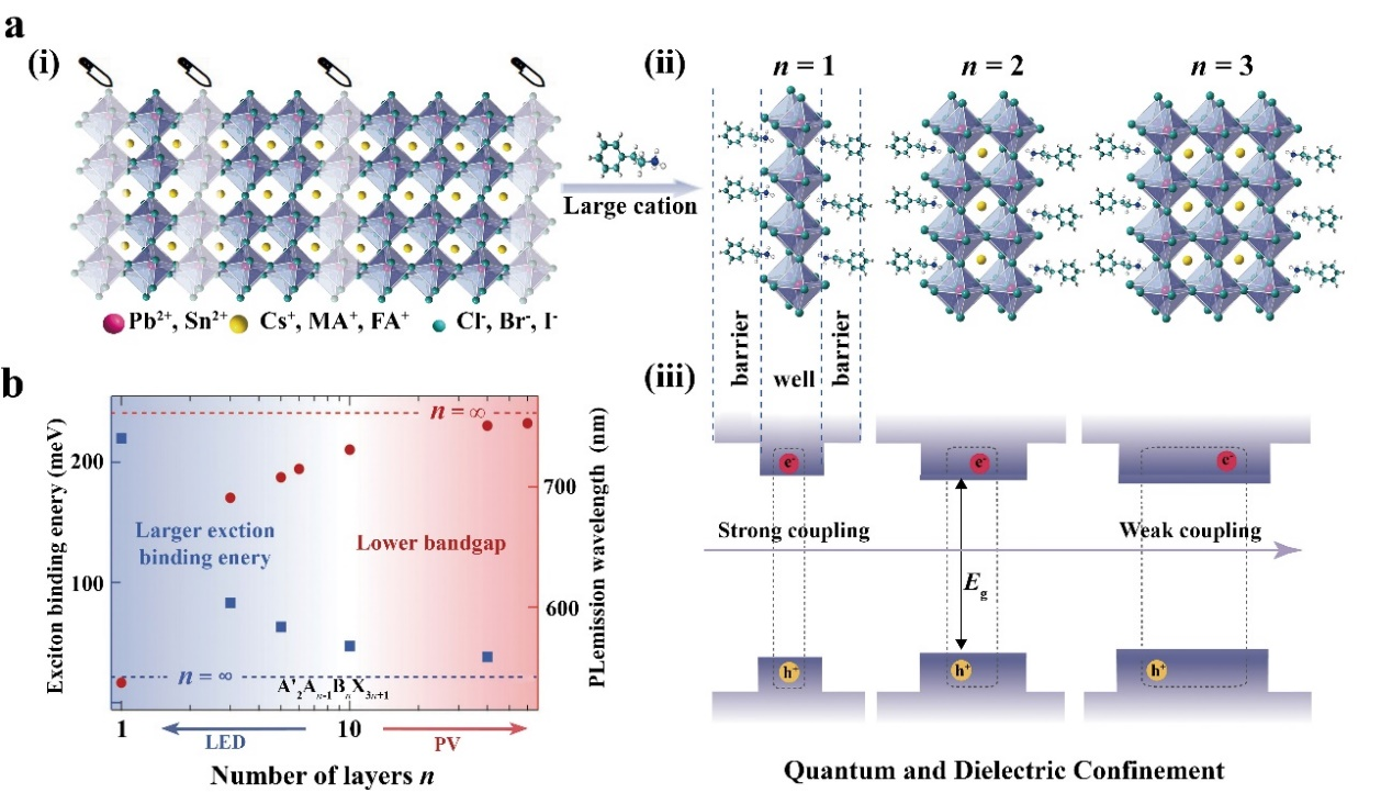 对于准二维钙钛矿来说,室温下激子态的鲁棒性是其最显著的光学特征,而激子态的鲁棒性源于大的激子结合能(Eb)。具体而言,准二维钙钛矿具有天然的量子阱结构,诱导产生介电限域和量子限域效应,进而赋予其大的激子结合能(Eb)(图1a)。此外,激子结合能的大小可以通过组分和结构工程进行调控,e.g. 不同介电常数的有机阳离子可以显著调节介电限域效应,通过改变量子阱的厚度而受到限域效应的调制等 (图1b)。
