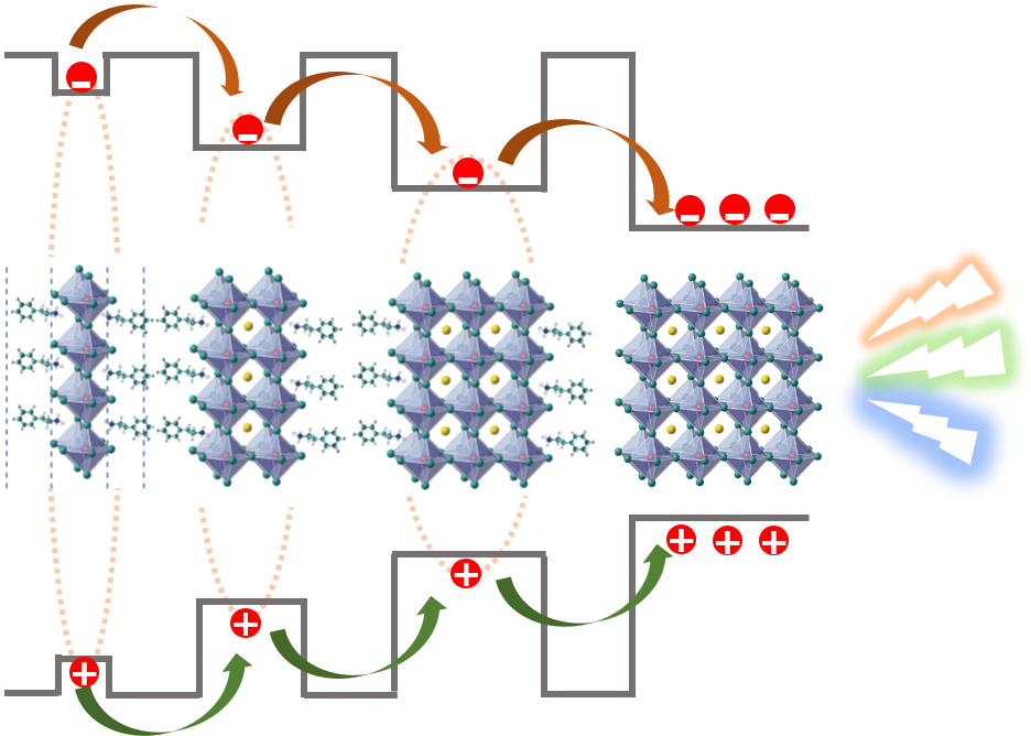 目前,准二维钙钛矿由于其优异的半导体性能引起了人们的广泛关注,已成为新一代发光二极管(LED)应用最有希望的材料之一。特别是由于其固有的量子阱结构,使准二维钙钛矿具有较大的激子结合能。同时,不同厚度量子阱组分间的快速能量转移导致了材料的高光致发光量子产率,为其在高效发光二极管中的应用提供了基础。