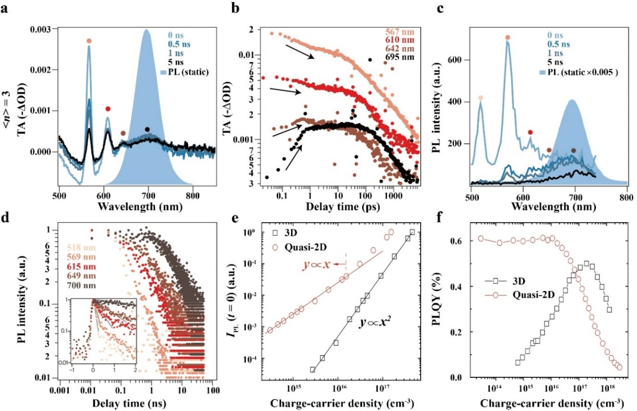 此外,准二维钙钛矿单晶体中的载流子复合动力学表明,在低n值准二维钙钛矿相中,激子结合能较大,保证了有效的激子复合; 在高n值相中,随着激子结合能的减少,激子倾向于分解为自由载流子。因此,进一步确定了准二维钙钛矿作为光电材料的潜在用途,如太阳能电池和发光二极管。