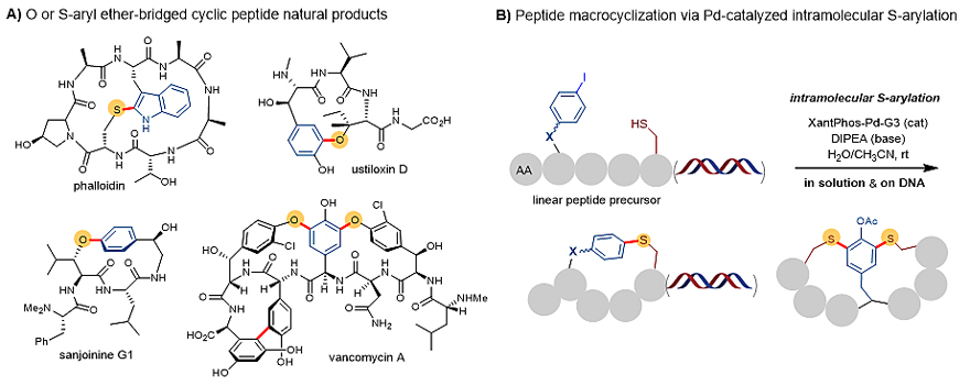 具有生物活性的天然产物如sanjoinine、ustiloxin、vancomycins和phalloidin等结构中,经常会出现芳基醚或者芳基硫醚骨架,通常认为这类关键连接结构与其生物活性具有密切关系。近年来Buchwald课题组和Messaoudi课题组报道了在生物兼容条件下,选择性的实现巯基芳基化。受他们工作的启发,作者设想能否在DNA兼容的条件下实现巯基芳基化构建肽类大环化合物库。
