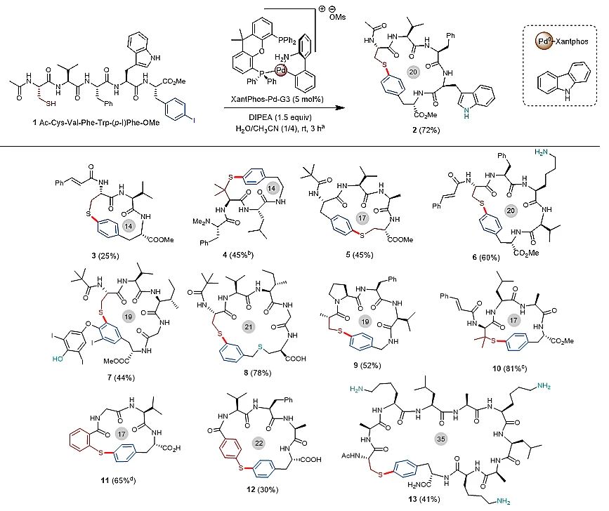 在最佳反应条件下,作者对反应的兼容性进行了探索(图2),作者发现:(1)所有的蛋白源氨基酸都能够兼容;各种氨基酸极性侧链都不干预反应;N端可以是特戊酸、肉桂酸、异烟酸等酰基封端。(2)反应成环的大小在17-20元环之间都能够以较高的收率获得;14元环的三肽3和4能够以中等产率获得;其中化合物4是模拟天然产物sanjoinine的核心骨架。35元环的化合物13能够以41%的收率获得。(3)除了(4-I)Phe (2)外,在各种位置的芳基碘也都能进行反应,如侧链假肢结构(8)或端基(9)。肽链上含甲状腺素时,主产物为化合物7。(4)半胱氨酸残基可以处于多肽链的C端和N端。除了半胱氨酸外,各种巯基结构单元如3-巯基丙酸,卡托普利(9)青霉胺(4,10)也能顺利成环。相对于烷基硫醇,芳基硫醇的反应性会略有降低,能够以中等以上的产率获得二芳基硫醚分子(11,12)。