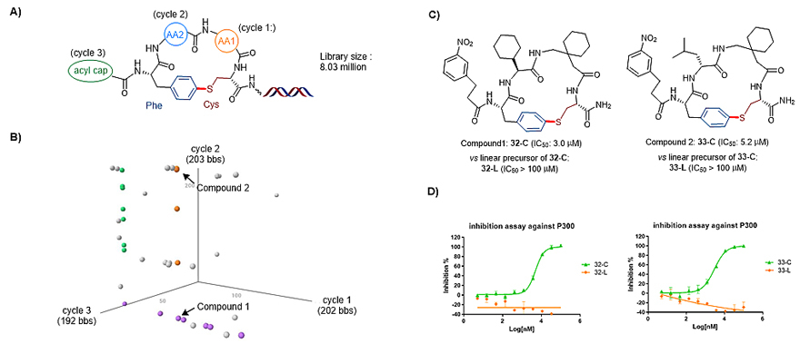 近年来,利用DNA编码化合物库(DELs)技术进行苗头化合物的筛选是新药发现最前沿的技术之一,得到了学术界和工业界高度的关注。然而构建结构多样、高质量的化合物库,并且还要确保与DNA相兼容的反应条件,是该方法所面临的主要挑战。近日,英国上市公司365陈弓教授课题组与上海药物所陆晓杰研究员课题组合作,通过Pd催化分子内巯基的芳基化反应在温和条件下实现了具有苯环支撑架结构的刚性环肽分子库的构建。运用该方法成功的制备了包含八百万个环肽分子的DNA编码化合物库,以P300为靶标蛋白进行亲和力的初步筛选,得到了微摩尔抑制活性的苗头化合物。
