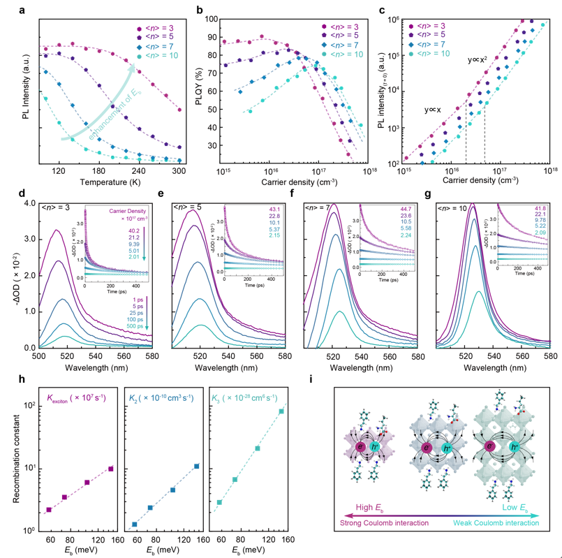 研究发现薄膜的发射行为与Eb之间有很强的相关性。对于低<n>值的薄膜,大的Eb导致了快速的激子和自由载流子复合,这避免了载流子在陷阱态中解离和猝灭。结果,低<n>值的膜在载流子激发的起始阶段下表现出高的PLQY。然而,大的Eb还带来了严重的俄歇复合,使的低<n>值薄膜在高电流密度下出现明显的PLQY滚降。而对高<n>值的薄膜,结果则相反,高<n>值薄膜中降低的俄歇复合速率,使薄膜更有望应用于高亮度器件。
