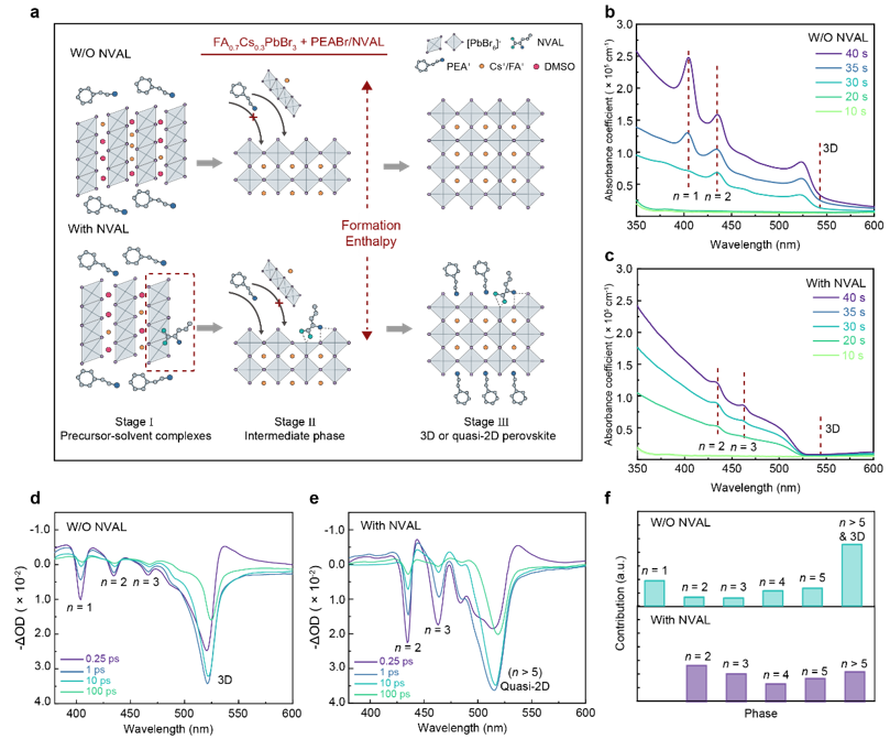 鉴于此,该课题组提出了一种“中间相调控”策略。研究发现,利用与无机层具有高结合力的两亲性氨基酸—正缬氨酸(NVAL)作为表面配体,会显著降低准二维钙钛矿相的生成能。这一策略引入了一个全新的、低势垒的成核结路径,NVAL的引入使准二维钙钛矿薄膜的成核结晶起始于准二维相而非三维钙钛矿相,这显著抑制了相分离的发生。利用该策略,在不使用反溶剂的前提下,研究人员在5.0 × 5.0 cm2 的大尺寸基底上获得了高质量的PEA2(FA0.7Cs0.3)4Pb5Br16 准二维钙钛矿薄膜。