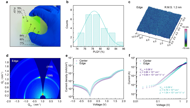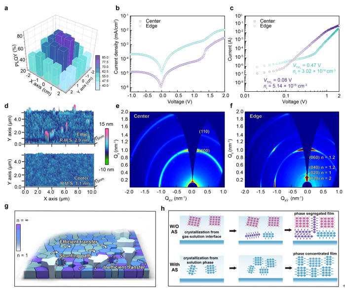 准二维钙钛矿薄膜由于其出色的光学性能已经在发光二极管(LED)器件应用中取得了成功。准二维钙钛矿薄膜可通过简单的旋涂法获得,并可通过调控其激子复合动力学与结晶动力学实现优异的电学、光学性能。然而,当器件面积扩大时,器件性能会出现严重下降,这极大地阻碍了准二维钙钛矿LED器件的进一步商业化应用。