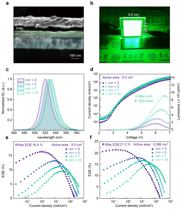 进一步,研究人员制备具有不同准二维钙钛矿活性层的大面积(9.0 cm2)钙钛矿LED器件。所有的器件表现出高度的EL均匀性。<n> = 3器件在1.0 mA cm-2的低电流密度下展示了16.4%的峰值EQE(外量子效率),代表了迄今为止最高效率大面积钙钛矿LED器件,相应的小面积器件获得了高达21.3%的峰值EQE。随着<n>值的增加,器件的EQE滚降阈值不断增大。<n> = 10器件的最大亮度为91,650 cd m-2,显示其在高亮度应用中的潜力。