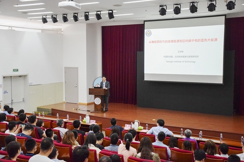 王中林院士以“从物联网时代的高熵能源到迈向碳中和的蓝色大能源”为题,向现场师生展示了一种崭新的发电技术,不但能够提供物联网中的分布式能源,同时也能来收集海洋中的蓝色能源,为“碳中和”目标做出贡献。他指出,我们当前的能源主要是以化石能源为代表的低熵能源,例如煤炭、石油、天然气等,经过燃烧、发电、输运和应用等过程,这些高质量能源最后变为低质量的能量耗散在自然界。根据热力学能量守恒定律,化石能源的大量利用必然带来全球气候变暖和分布在环境中无序、低质量的高熵能量的增加。高熵能源指的是散布在自然界中无处不在、无时不有、散乱但总量巨大的弥散式能源。从近期目标看,物联网、传感网络、机器人和人工智能时代的到来急需我们开发高熵能源来持续的驱动这些分布性广、移动性强、功耗小但数目居多的电子器件。从长远的目标看,减少化石能源的利用、实现碳中和的根本途径之一就是开发海洋中蕴含着丰富而清洁的蓝色能源,包括波浪能、潮汐能等。“如果海洋能源能实现大规模工业应用,它将是一种崭新的、绿色的、取之不尽的大能源,将极大缓解人类对于化石能源的需求,降低二氧化碳排放,带来世界能源格局的巨大变化。”王中林表示。