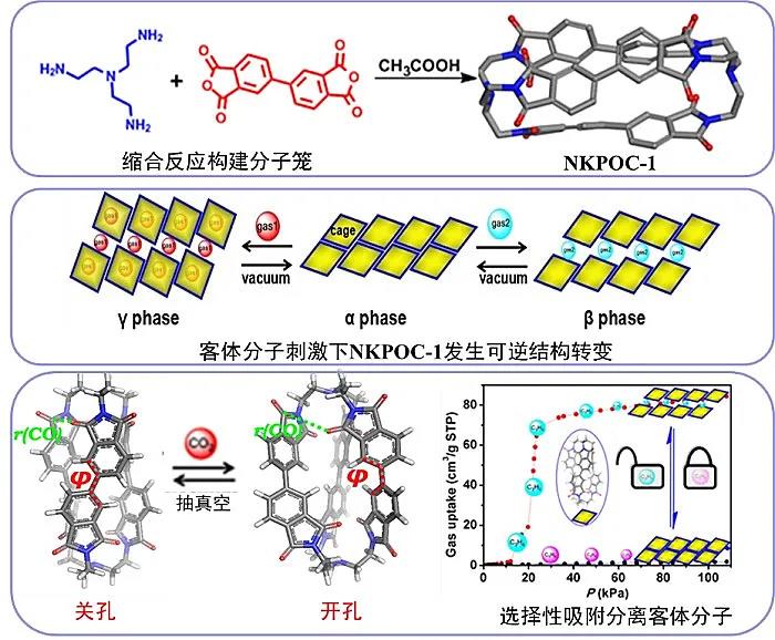 柔性多孔材料是近年来新兴的新型智能材料,在外部刺激下可以发生可逆的结构转变,在智能识别、传感以及气体存储/分离等领域展示了巨大的应用潜力。已报道的柔性多孔材料多为二维或三维材料,而零维柔性多孔有机笼(POCs)一直难以获得。张振杰课题组针对这一合成挑战,设计合成了一类酰亚胺连接的[2+3]型有机笼,通过自组装获得了兼具笼内孔和笼外堆积孔的柔性多孔晶体(NKPOC-1)。研究发现,在不同客体分子的刺激下,晶体结构发生可逆的相变(β相↔α相↔γ相),笼内孔和笼外堆积孔可以选择性“开合”,从而实现客体分子的选择性吸附和分离(图8)。例如,NKPOC-1可以选择性吸附CO2,而不吸附N2;当其暴露在C3轻烃气体的氛围中时,在常温常压下只吸附丙炔。作者进一步阐明了材料的选择性响应机理,与合作者利用原位粉末X射线衍射和分子动力学模拟对NKPOC-1的结构转化和选择性吸附行为进行了详细的研究,阐释了分子笼可以通过联苯基团的旋转来控制孔的开合,揭示了不同气体进入笼间孔需要跨越不同能垒而导致其选择性吸附。该工作创建了一类新型智能响应体系,并提出了新的智能开关机理,相关论文发表在J. Am. Chem. Soc.杂志(J. Am. Chem. Soc., 2019, 141, 9408)。