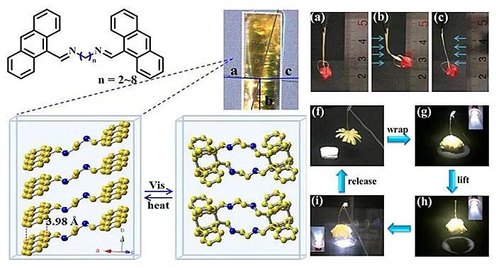 图3. 蒽分子晶体结构以及所构建的人工肌肉在光控制下提升重物、抓取物体示意。