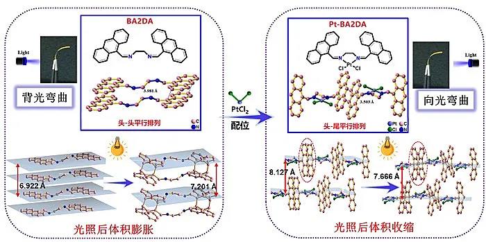 为了精确调控智能材料的驱动性能,揭示分子晶体结构与驱动性能的构效关系,张振杰课题组提出了结构调控以控制光响应功能的新策略。将金属铂离子引入蒽分子(BA2DA)中,通过配位自组装使蒽基团在分子晶体中由“头-头”平行排列变为“头-尾”平行排列,最终实现了对材料光响应运动方式的精确调控:由背光弯曲转变为向光弯曲(图5)。通过原位测试,证实Pt-BA2DA在光照下发生蒽[4+4]环加成,生成了罕见的一维线性高分子(poly(Pt-BA2DA)),并发现在聚合过程中晶胞体积发生收缩,而在加热解聚的过程中晶体又能恢复。利用这一特性,将分子晶体与高分子通过混合基质策略进行复合,创制了一种高性能光响应晶态人工肌肉。该工作不仅创建了制备线性高分子晶体的新策略,而且拓宽了其在药物缓释和智能响应方面的应用。相关研究成果发表在Angew. Chem. Int. Ed.杂志(Angew. Chem. Int. Ed., 2019, 131, 18807),并受邀撰写了光响应晶体的综述文章(内封面,Chem. Eur. J., 2019, 25, 5611)。