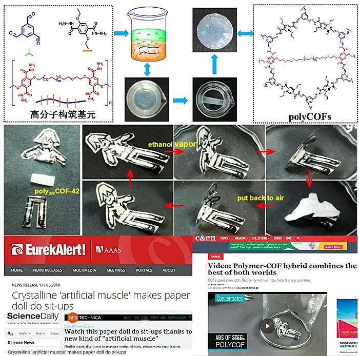 能够把外部刺激(光、电、蒸汽等)的能量转化为机械能的智能材料可广泛应用于人工肌肉、仿生机器人、智能假肢等领域。如何提升其驱动性能(如能量转化效率和响应速度),是亟待攻克的挑战之一。针对这一挑战,张振杰课题组通过合成策略创新,将共价有机框架(COFs)发展成一种新型的晶态智能材料。传统COFs都是由小分子单体聚合得到的,通常以粉末状态存在而不具有成型加工性,这制约了其在智能材料领域的应用。基于此,作者首创了“原位一体”的合成策略,创新性的设计合成了聚乙二醇(PEG)桥联的线性高分子直接作为COFs的构筑基元,创制了一类具有高结晶性和机械性能的新型COFs(polyCOFs)。PEG的引入不仅极大提升了COFs的成膜性、柔韧性和成型加工性,并且赋予其蒸汽响应的新功能。利用polyCOFs制备的一系列“晶态人工肌肉”,在蒸气刺激下可以进行复杂的仿生运动,如:提拉重物和仰卧起坐等。该工作发表在ACS Cent. Sci.杂志(ACS Cent. Sci., 2019, 5, 1352),并获得ACS Weekly PressPac、C&EN、EurekAlert!、Science Daily等国内外知名科学媒体的广泛报道(图1)。